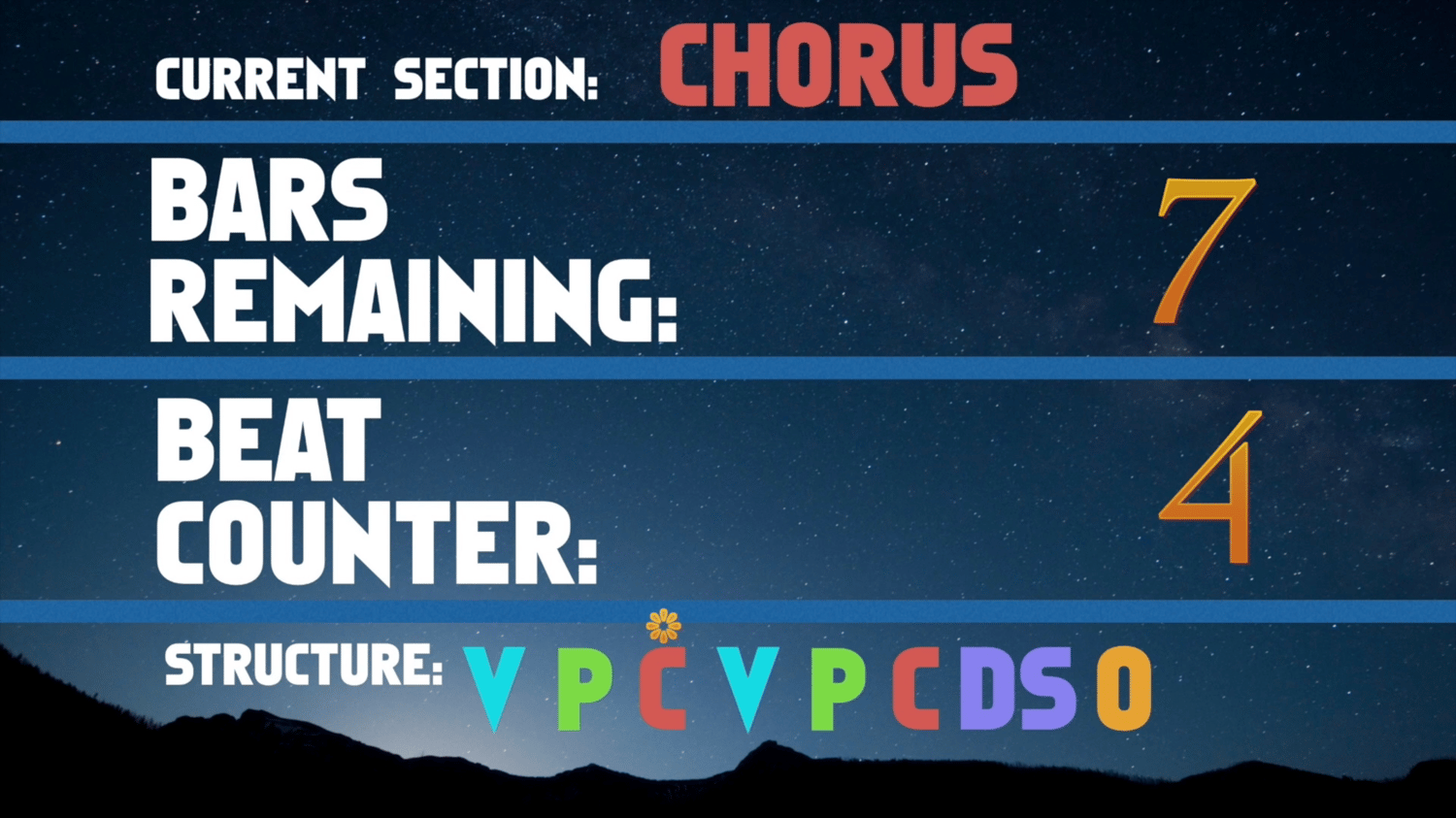 1) Which section you are currently playing (e.g verse, chorus, bridge etc)